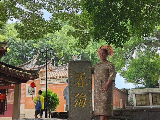 头戴簪花的伊莎贝拉在泉州真武庙“吞海”石碑前留影。张礼珍 摄