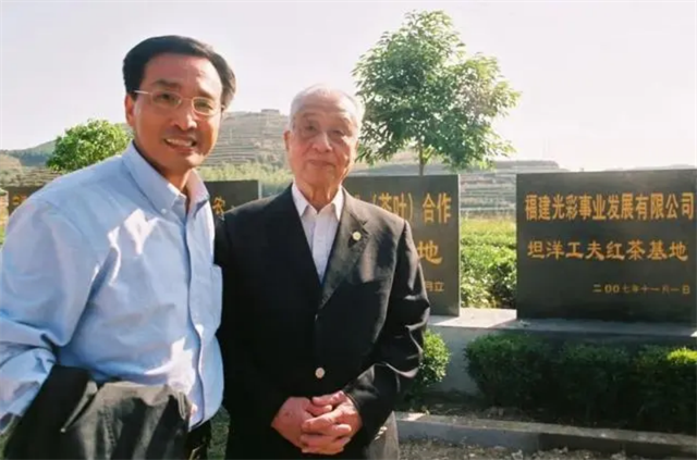 2008年,魏文生(左)与茶界泰斗张天福(右)在福安光彩事业项目——坦洋工夫红茶基地合影。受访者供图