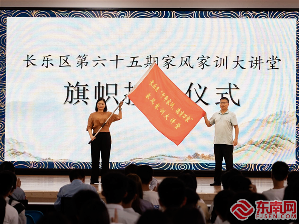 大讲堂最后,福建省长乐高级中学校长陈传意将旗帜接力给第六十六期家庭教育大讲堂的承办方福州市长乐区朝阳中学,福州市长乐区朝阳中学书记、校长游碧华代表接过旗帜。这一旗帜既象征着传承和使命,同时也包含着对中华优秀传统文化的热爱。