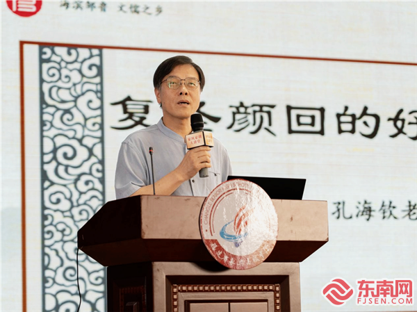 本期大讲堂《复圣颜回的好学精神》主题讲座由孔子第75代世孙、儒学家、书法家、福州文儒书院创办人孔海钦老师主讲。他谈到读书就是要有好学精神,培养自学能力、自律能力、自产能力,解决自我前途迷茫、困惑、忧伤、痛苦、抑郁的能力。做到克己复礼,克制私欲过剩、伤天害理的行为,即“非礼勿视,非礼勿听,非礼勿言,非礼勿动。”