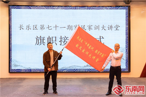 本期大讲堂最后,福州市长乐区海峡路小学校长郑锦云将旗帜接力给第七十二期家庭教育大讲堂的承办方航城中学,廖志平校长代表接过旗帜。这一旗帜既象征着传承和使命,同时也包含着对中华优秀传统文化的热爱。读书人,立志于正道,坚守学习。君子乐于读书、传道、为己而学。每一代人,留给后世的一定是其精神财富,以及家德、家风、家规、家训、家道、家门、家教、家法、家谱等。