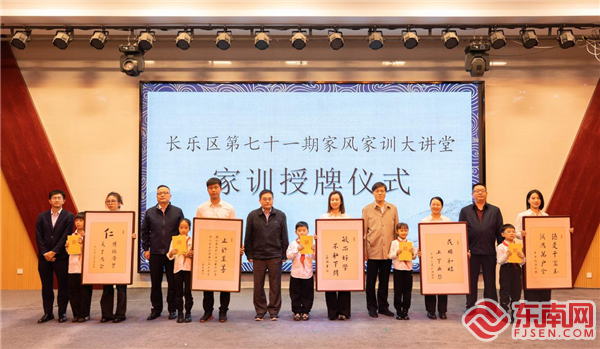 大讲堂中,现场领导、嘉宾将德诚慈善基金会颁发的家训牌匾授予本次活动的“好家风示范家庭”。