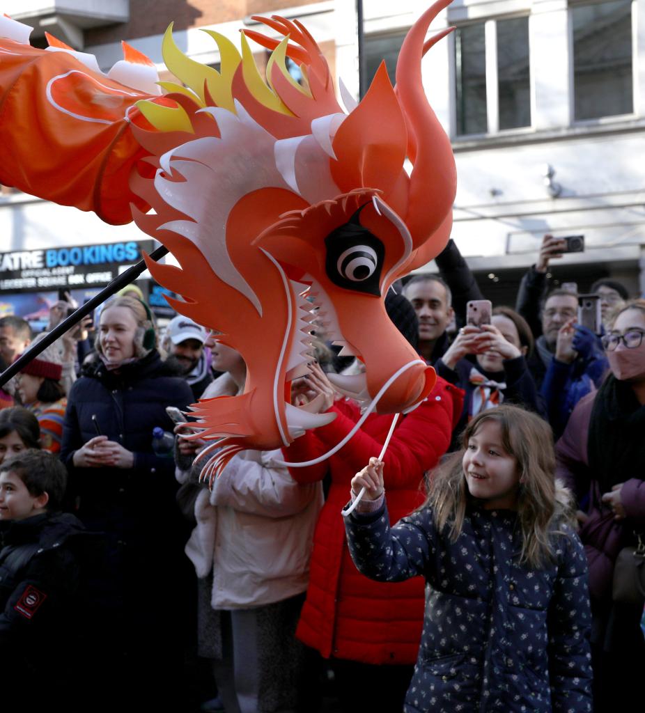 2月2日,一名女孩在英国伦敦举行的新春巡游活动上与“中国龙”互动。新华社记者 李颖 摄
