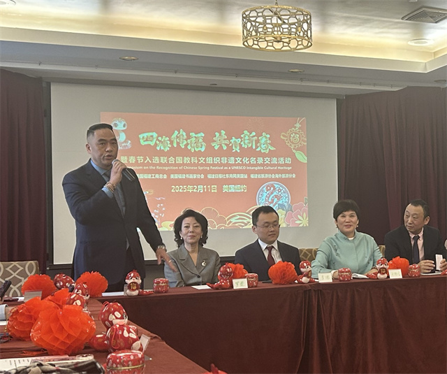 东南网2月13日讯(特约记者 白水 纽约墨人)当地时间2月11日,“四海传福·共贺新春”暨春节入选联合国非遗文化名录交流活动在纽约举行。中国驻纽约总领馆领侨处副主任李德、领事邢玉临,纽约州众议员金兑锡代表罗曼,联合国宗教非政府组织委员会秘书古陆基(Guruji H.H. Dileepkumar Thankappan),联合国教科文组织纽约协会主席李依凌,世界中华妈祖文化发展基金会创始人执行会长林泳莉,纽约当地文化和旅游界友好人士,以及来自美国纽约、费城、新泽西、波士顿、佛罗里达州等地闽籍侨团代表等近百人参加活动。交流活动由王早早主持。