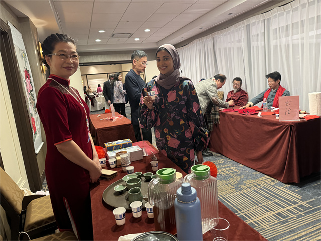 活动现场摆放着各种“福”字、小灯笼、蛇年公仔吉祥物、福茶、剪纸等,洋溢着浓厚的节日气氛,让到场的中美嘉宾感受到了中国传统文化的魅力。在品福茶环节,嘉宾们品尝了来自中国福建的优质茶叶,感受茶香四溢的愉悦;赏书法环节则展示了中国书法艺术的博大精深,美国福建书画家协会的书法家们现场挥毫泼墨,为活动增添了浓厚的文化气息。中美嘉宾在交流互动中,纷纷表达了对中国传统文化的热爱和尊重。
