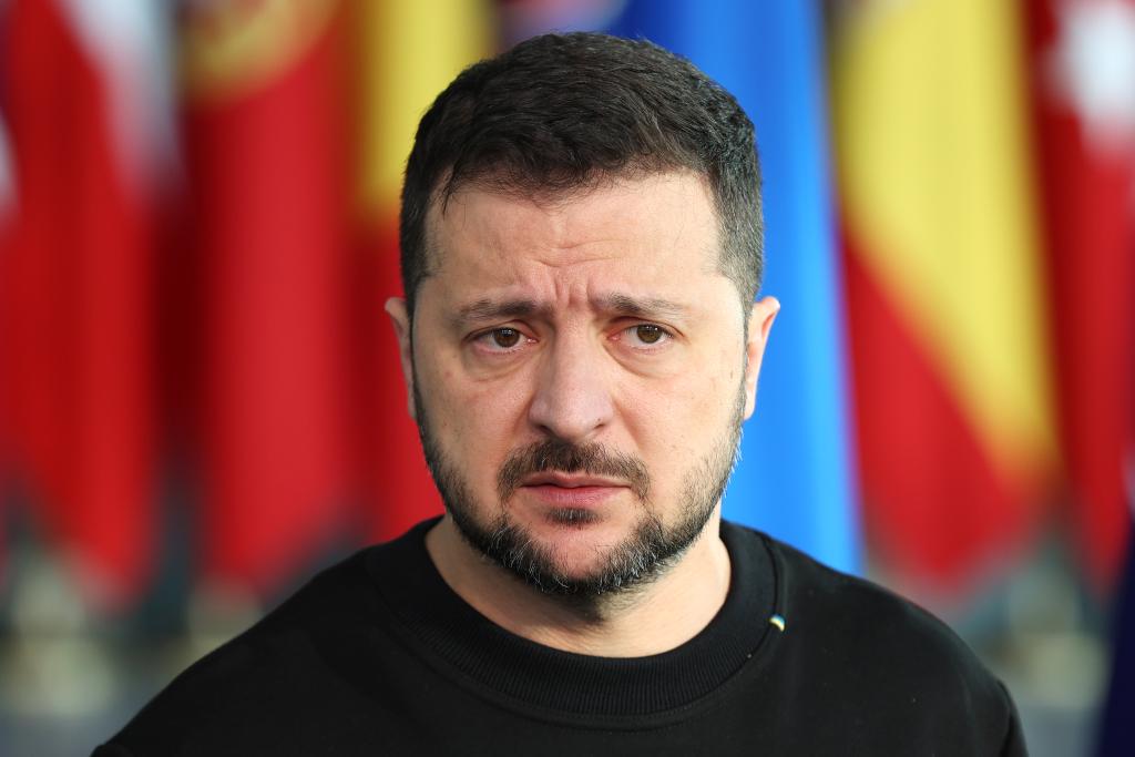 2023年10月11日,乌克兰总统泽连斯基在比利时布鲁塞尔出席北约防长会时接受记者采访。新华社记者赵丁喆摄