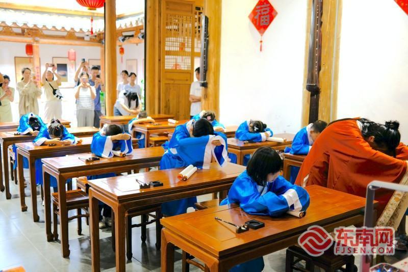 东南网8月30日讯(记者 郑悠扬)8月30日上午,由福建省图书馆主办的“乙巳年秋季开笔礼”活动在福建省图书馆正谊书院举办,来自中山小学、钱塘小学屏北分校等学校的一、二年级学生身着书童服,以庄重姿态参与这场传统启蒙仪式。