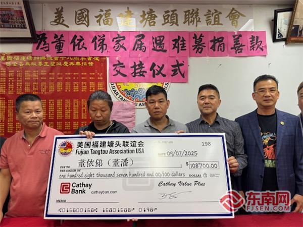 东南网9月8日讯(特约记者 纽约墨人)当地时间9月2日,美国福建塘头联谊会在其纽约会所举行为遇难塘头乡亲董依俤(董潘)家庭募捐善款10多万美元的交接仪式(以下简称“交接仪式”)。