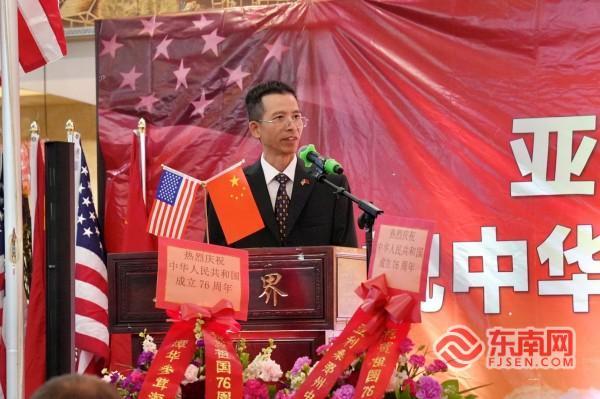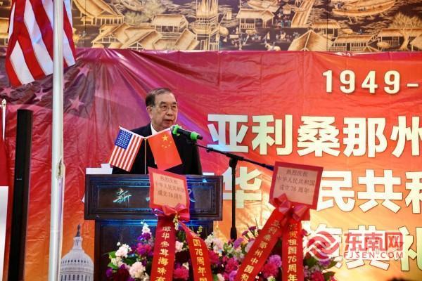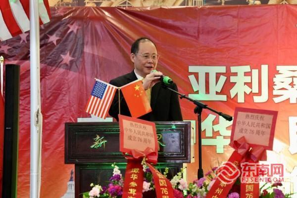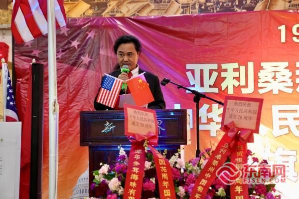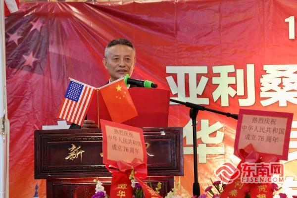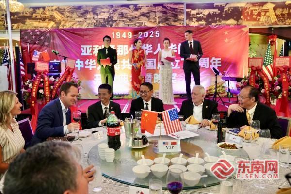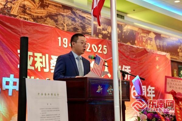 东南网9月22日讯(特约记者 杨文田)当地时间9月20日晚,亚利桑那州华侨华人在新世界商场隆重举行升旗典礼和国庆晚宴,庆祝中华人民共和国成立76周年,并纪念中国人民抗日战争暨世界反法西斯战争胜利80周年。中国驻洛杉矶总领事馆副总领事黄洪江率总领馆王瑞祥、田林琳、黄晨三位领事到场,当地政要、侨领及社会各界代表近600人共同出席了这场盛大庆典。