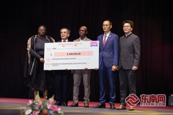 在演出间隙,南非JINA鞋业集团还向当地社区克莱伍德中学(Clairwood Secondary School) 捐赠20万兰特用于建设该校的多媒体教室。李总领事与博伊斯议长等共同见证捐赠仪式。捐赠人蔡云景会长表示支持青年发展和本地社区建设是企业责任与光荣,也是投资南非未来的关键。