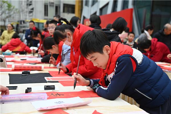 “送福纳祥 迎新启岁”百名师生写春联活动氛围感拉满,完美呼应条例“推动全民阅读融入日常生活”的倡导。孩子们挥毫泼墨,将“书香伴福”等联语落于红纸上,将阅读收获转化为创作灵感,更把对新年的祈福、对家乡的热爱融入笔端。现场设置的“春联福字免费送”环节,师生们将承载阅读感悟与福韵祝福的作品赠予读者,让条例倡导的“全民阅读”理念随新春祝福走进千家万户。