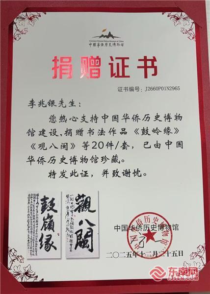 东南网2月23日讯(特约记者 纽约墨人)近日,中国华侨历史博物馆向美国中国书法家协会会长李兆银颁发捐赠证书,珍藏李兆银捐赠的书法作品《鼓岭缘》《观八闽》等20件。