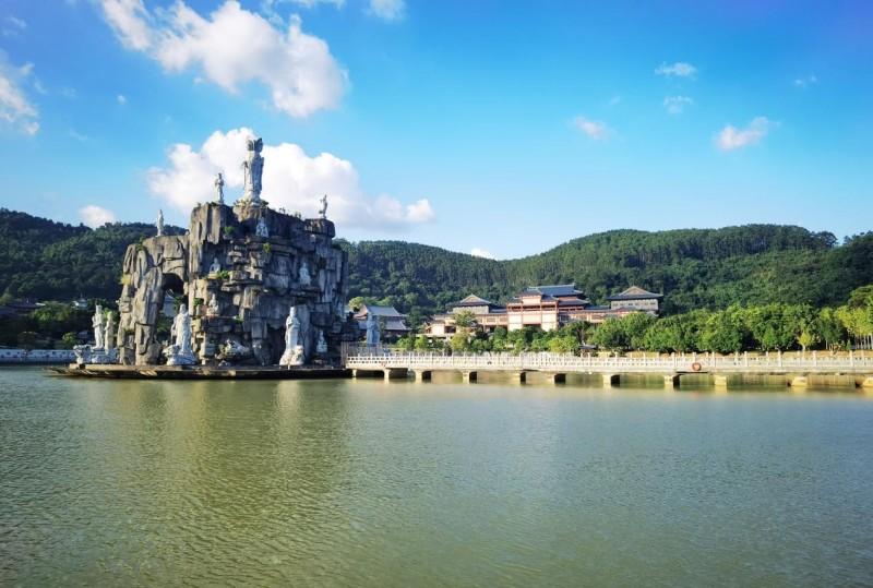 Wanfo Temple, formerly known as Qishan Shisong Temple, is located on the southeastern foothills of Qishan in Fuzhou, Fujian Province. It covers an area of about 1,310 mu. The main buildings are in a Song-style design, and the temple also preserves historical relics from the Ming Dynasty, including the Mahavira Hall and cliff stone carvings.