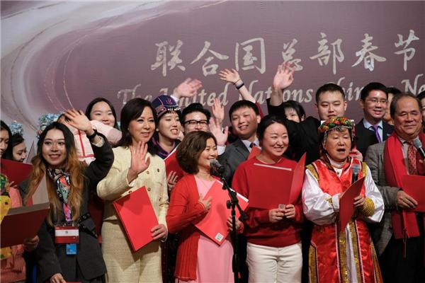 2026年联合国中国春节晚会,陈小芳(中)与外交官们共同演唱黄梅戏经典唱段《夫妻双双把家还》。(主办方提供)