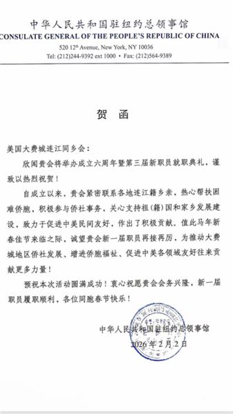 李德在致辞时,高度肯定大费城连江同乡会长期以来坚守初心、服务乡亲的卓越实践——始终心系桑梓、情牵故土,以“团结华人、服务侨胞、传承文化”为己任,是凝聚海外连江乡亲的坚实纽带,更是在推动中美民间交流、讲好中国故事、传播中华优秀文化中彰显担当。李德表示,大费城连江同乡会是侨胞信赖的“暖心之家”、中美友好的“民意桥梁”、侨社发展的“定盘之星”。殷切期望在会长刘用武带领下,新一届理事会以此次就职为崭新起点,深耕美国、反哺桑梓,持续当好福建乡亲的“贴心人”、中美民间友好的“连心桥”、侨社和谐发展的“压舱石”,为促进中美人文相通、服务中国高质量发展、助力民族复兴伟业贡献更多侨界智慧与力量。