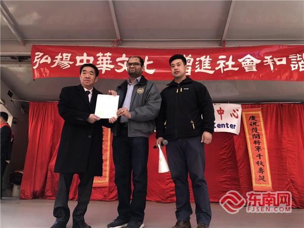 郑永佳给美国猴屿民俗文化中心颁发奖状