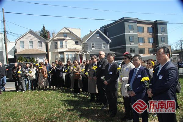 美国新泽西华人联合总会新任主席胡世远带领共同主席谢成杰、梁智、佟卫东、郭瑞尧、洪利武、李世群、王恒,与贝勒维尔市历史学会主席佩罗内(Michael Perrone)、菲尔莱狄更斯大学(FDU)教授Khyati Joshi(音译:克亚蒂·乔希)夫妇、华夏李文斯顿中文学校董事长王丹及新泽西福建同乡会、李文斯顿华协、新泽西山东同乡会、李堡华协、华美化学会、美国棋类协会等众多社团代表60多人参加祭奠活动。