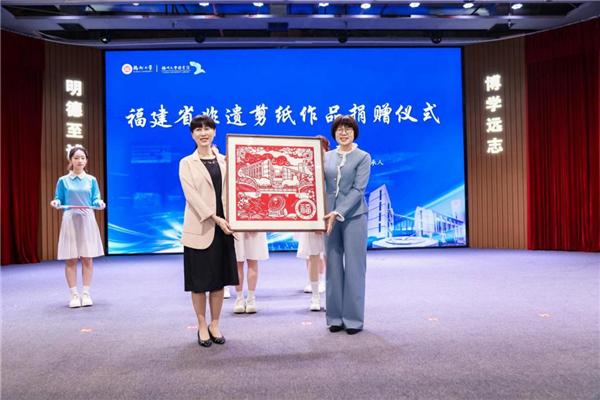 福州大学图书馆馆长林林接受周冬梅老师捐赠剪纸作品