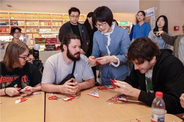 活动期间,浦城剪纸国家级非遗传承人周冬梅在福大·大梦书屋主讲“指尖上的温度”非遗大师劳作课,将古老的剪纸艺术带到师生身边。劳作课上,她从剪纸的历史渊源讲到福文化的内涵,将传统技艺融入现代审美,并手把手教授师生折纸、画样、剪刻等技艺,让师生在动手实践中“阅读”传统文化、感悟匠心精神。活动吸引了来自美国、德国、巴西、越南等国家的40余位外籍留学生与非遗爱好者参与其中,大家在红纸翻飞、剪刀起落间,沉浸式感受中国非遗的独特魅力。