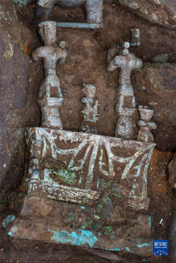 这是在四川德阳广汉市三星堆遗址考古发掘现场8号“祭祀坑”拍摄的青铜“神坛”局部(9月2日摄)。 新华社记者 王曦 摄