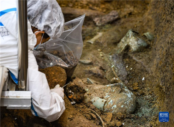 在四川德阳广汉市三星堆遗址,考古人员在8号“祭祀坑”内工作(9月2日摄)。 新华社记者 王曦 摄