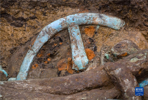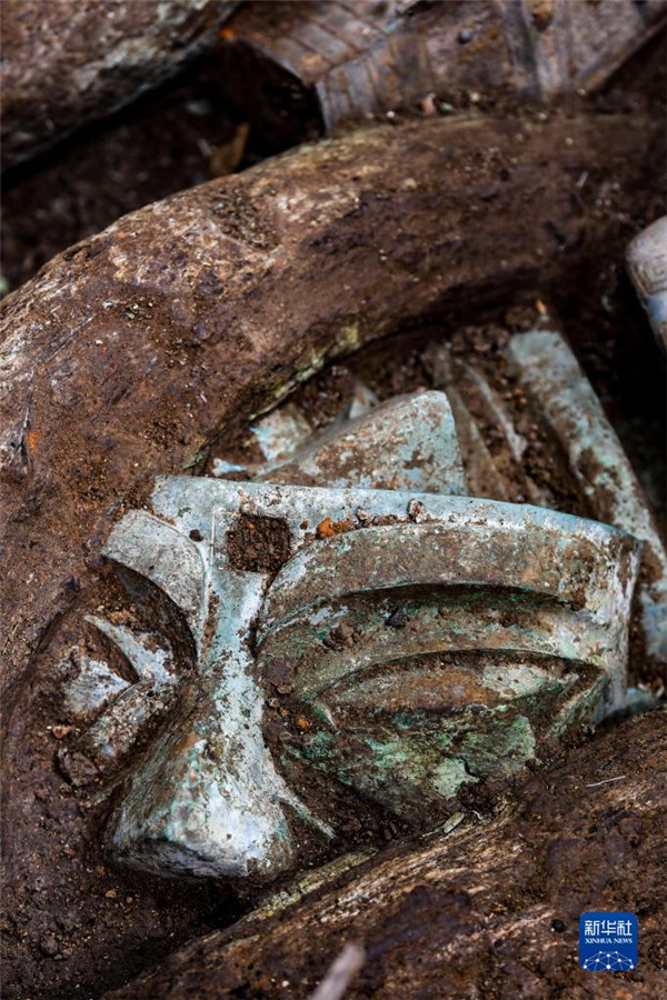 这是在四川德阳广汉市三星堆考古发掘现场8号“祭祀坑”拍摄的青铜太阳形器局部(9月2日摄)。 新华社记者 王曦 摄