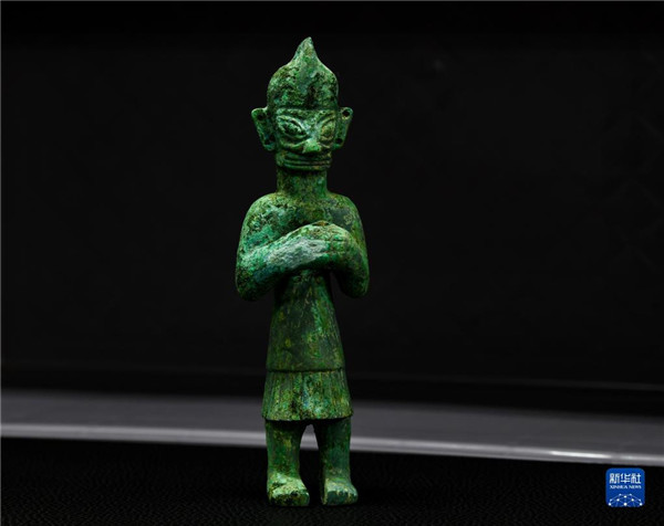 这是在四川省文物考古研究院三星堆考古研究所拍摄的三星堆遗址3号“祭祀坑”出土的青铜人像(9月3日摄)。 新华社记者 王曦 摄