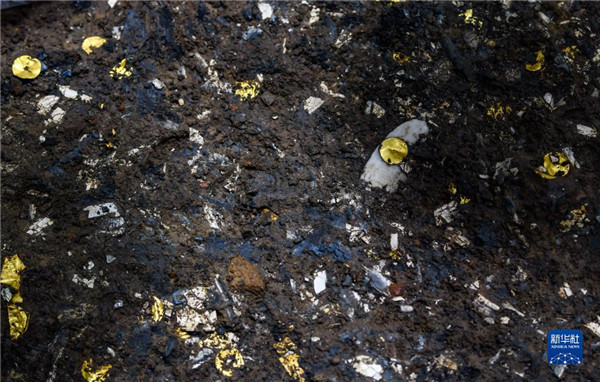 这是在四川德阳广汉市三星堆遗址考古发掘现场5号“祭祀坑”拍摄的玉器和金圆片(9月2日摄)。 新华社记者 王曦 摄
