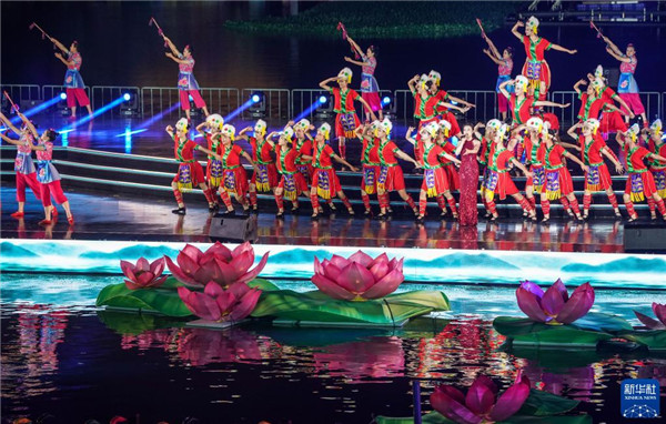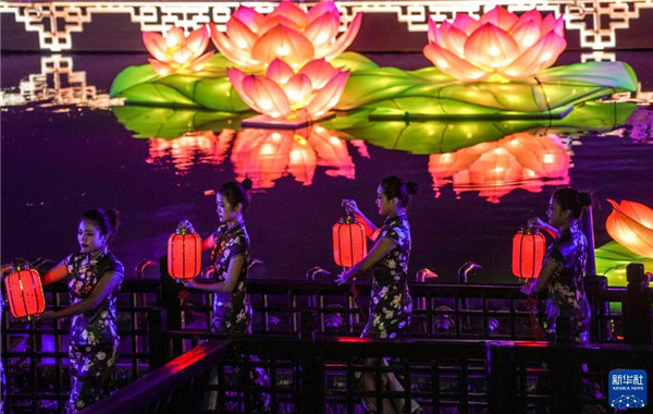9月16日,演员在开灯仪式上表演《湖光映月》。