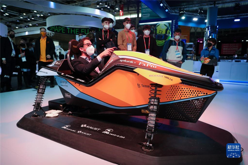 2月28日,参观者在西班牙巴塞罗那2022世界移动通信大会上体验模拟驾驶器。