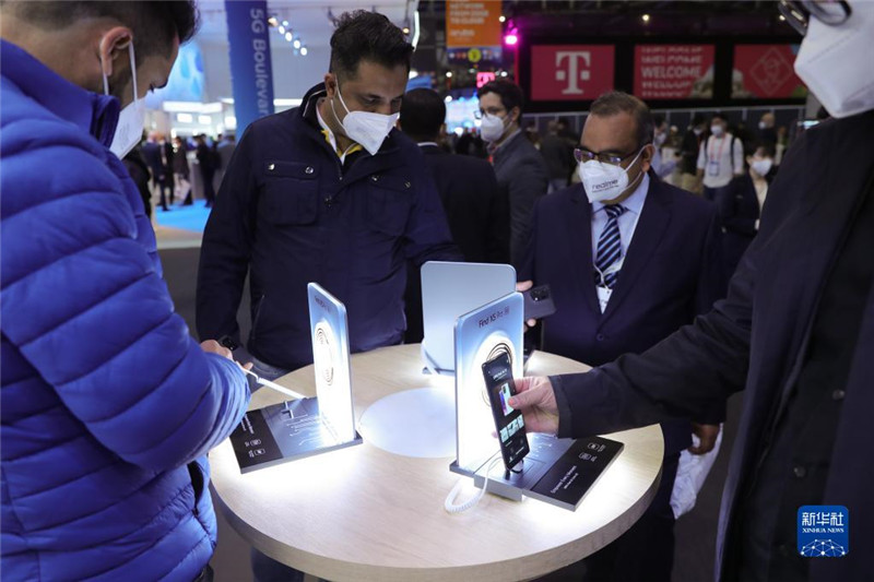 2月28日,参观者在西班牙巴塞罗那2022世界移动通信大会上体验OPPO新款手机。